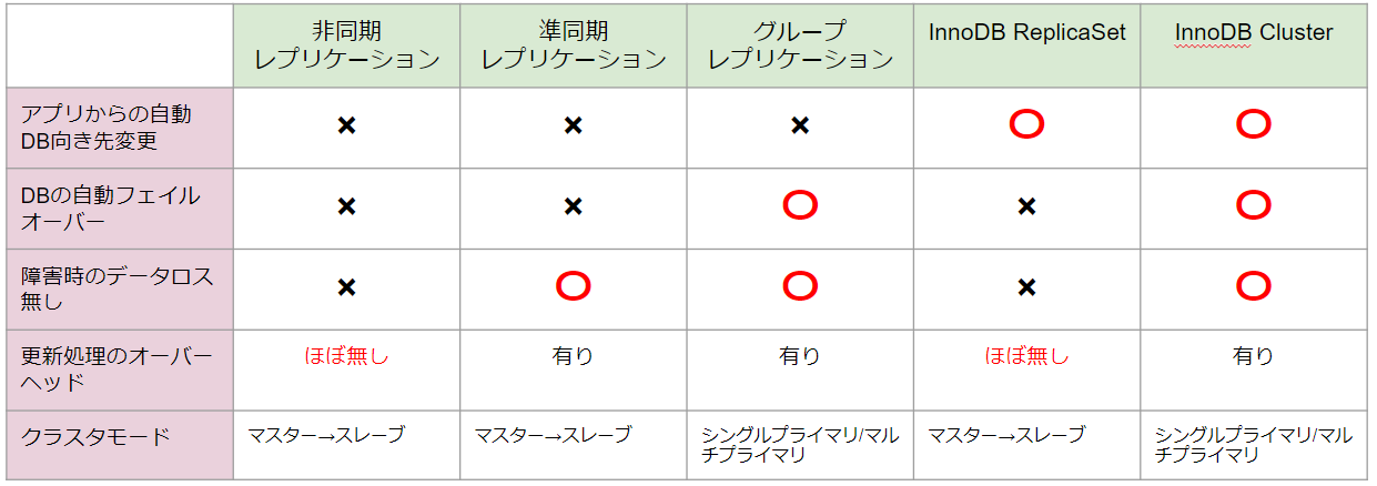 いままでの非同期レプリケーション、準同期レプリケーションでは自動フェイルオーバーやアプリからの向き先変更などは別のソリューション(HA ProxyやLB、MHAなど)を組み合わせる必要がありましたが、InnoDB ClusterはMySQLの公式機能のみですべてを補えるようになりました。