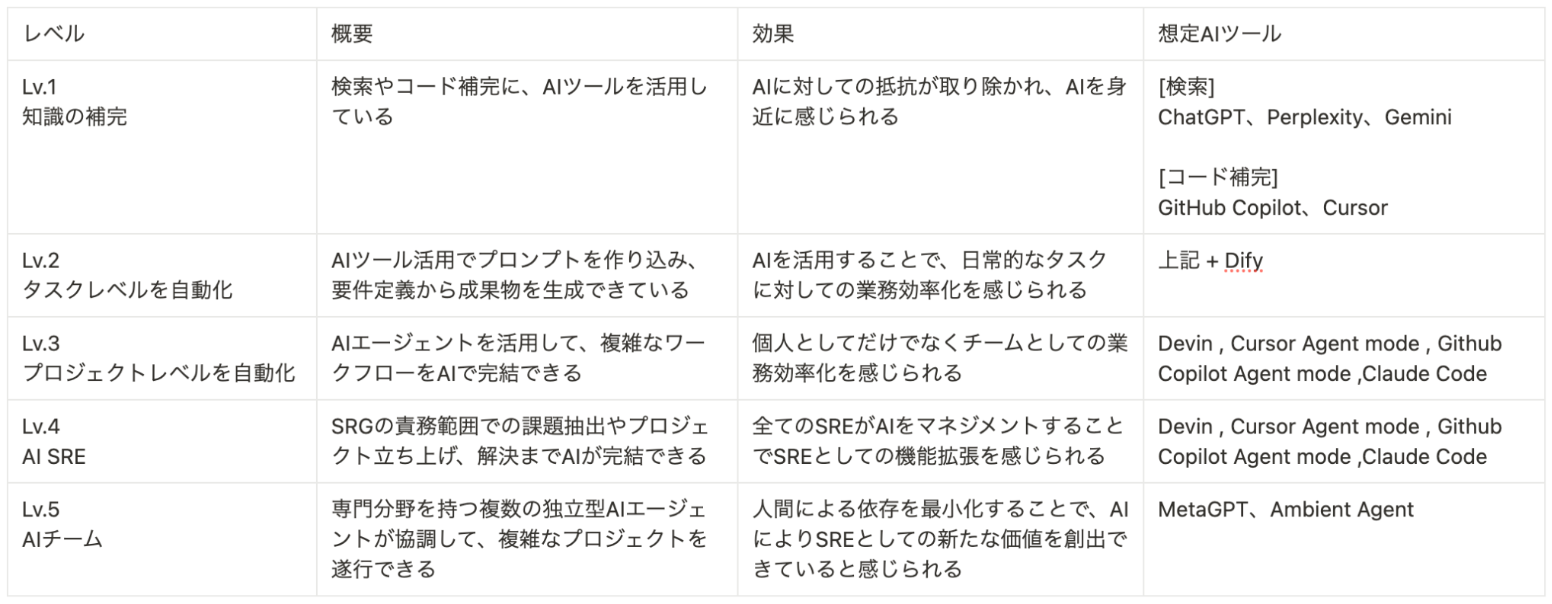 執筆期限もあり、今回の書籍では書くことができなかった話を少し出来ればと思います。多くの人の予想を超えるスピードで、AI技術は進化していっています。SREの実践を推進していくのと同じように、AI活用を推進していく上でも、組織構造はとても重要になります。今回の書籍では書くことができませんでしたが、AI時代のSREの組織がどう変化していくかは、気になる人もいるかも知れません。実際に、SRGでもAI活用を推進しており、SRE領域だけでなくアウトプットの強化やマネジメントなど幅広くAI技術の活用が広がっていっています。また、SRGとして事業やサービスに対してもインフラやSRE領域だけでなくAI活用の支援なども行なっています。