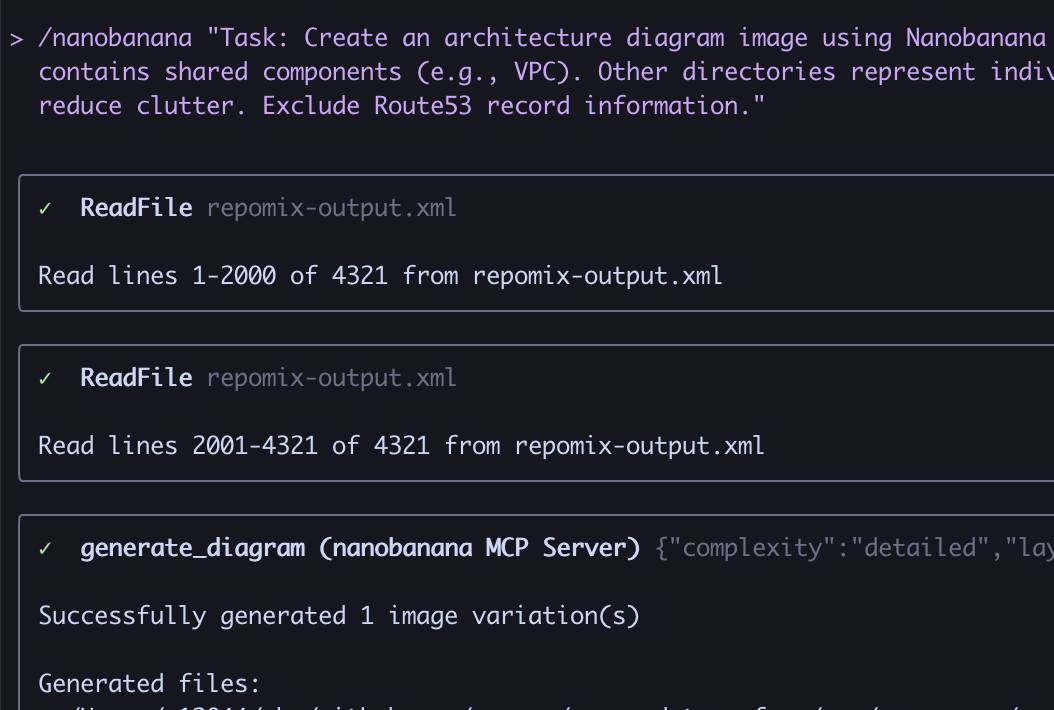 実行した画面を見てみると、repomix-output.xmlを読んで、generate_diagramのツールが呼び出されていることがわかります。