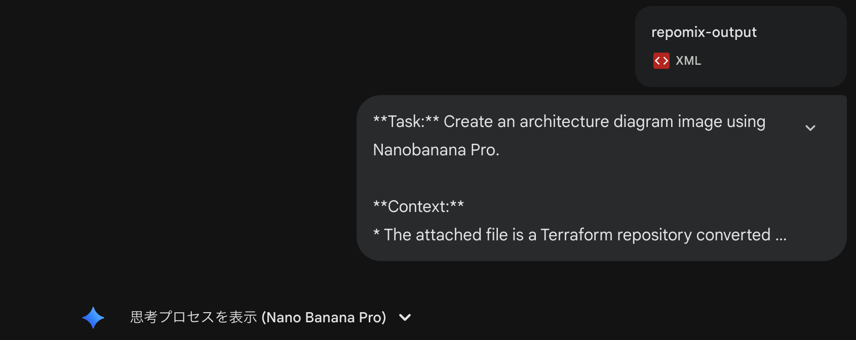 本記事は、TerraformのコードをRepomixで構造化したうえで、Gemini(Nanobana Pro)でアーキテクチャ図を作成すると良さそうという記事になります