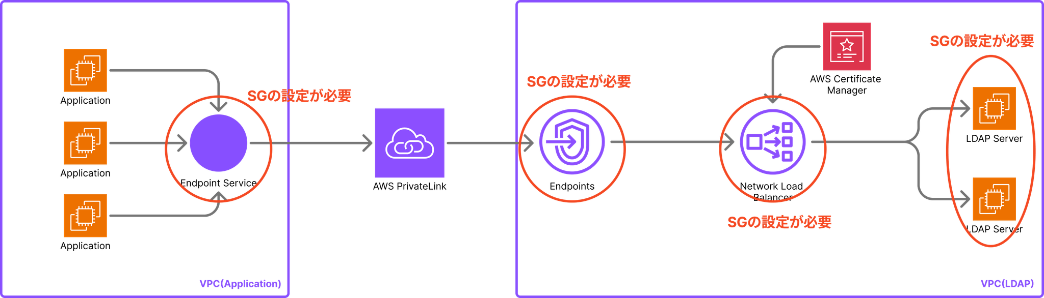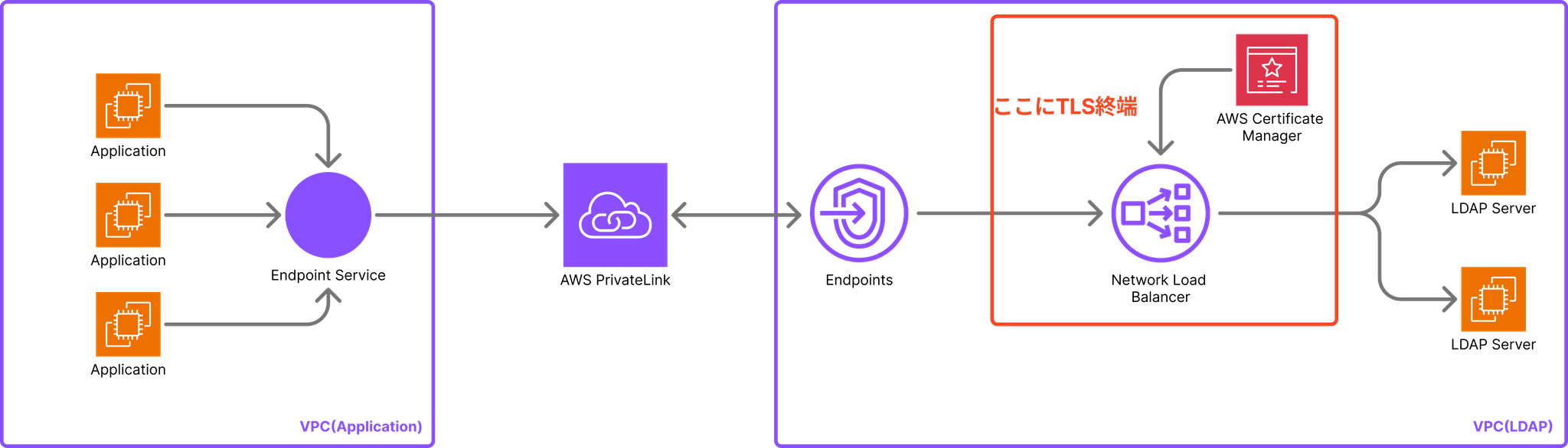 LDAPサーバを専用のVPC上に配置し、各アプリケーションが稼働するVPCからは AWS PrivateLink を介して当該LDAPサーバへ接続する構成とします。アプリケーションVPCからのLDAPアクセスは、すべて Network Load Balancer (NLB) を経由させることで集約し、通信経路および制御点を明確にします。