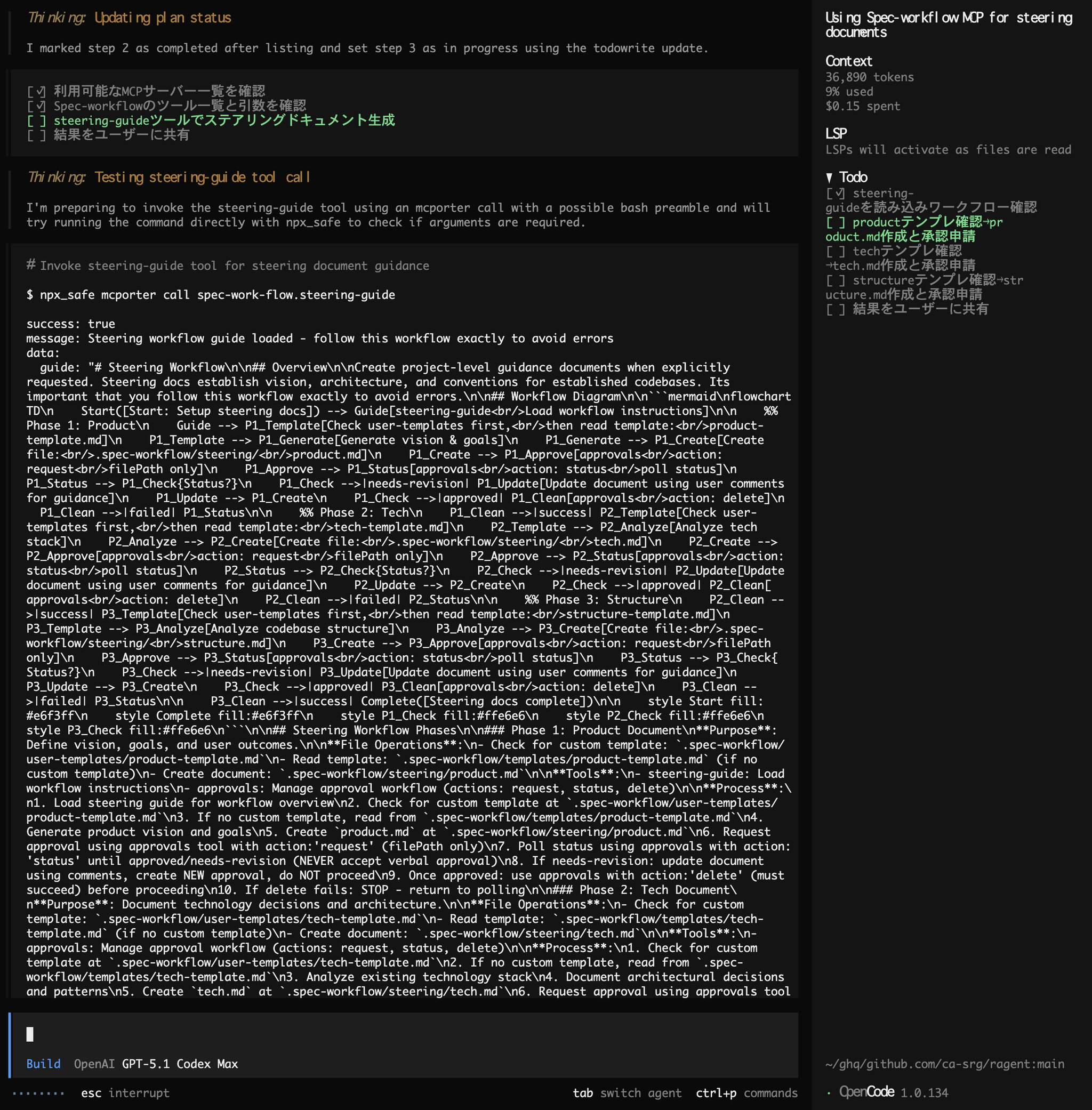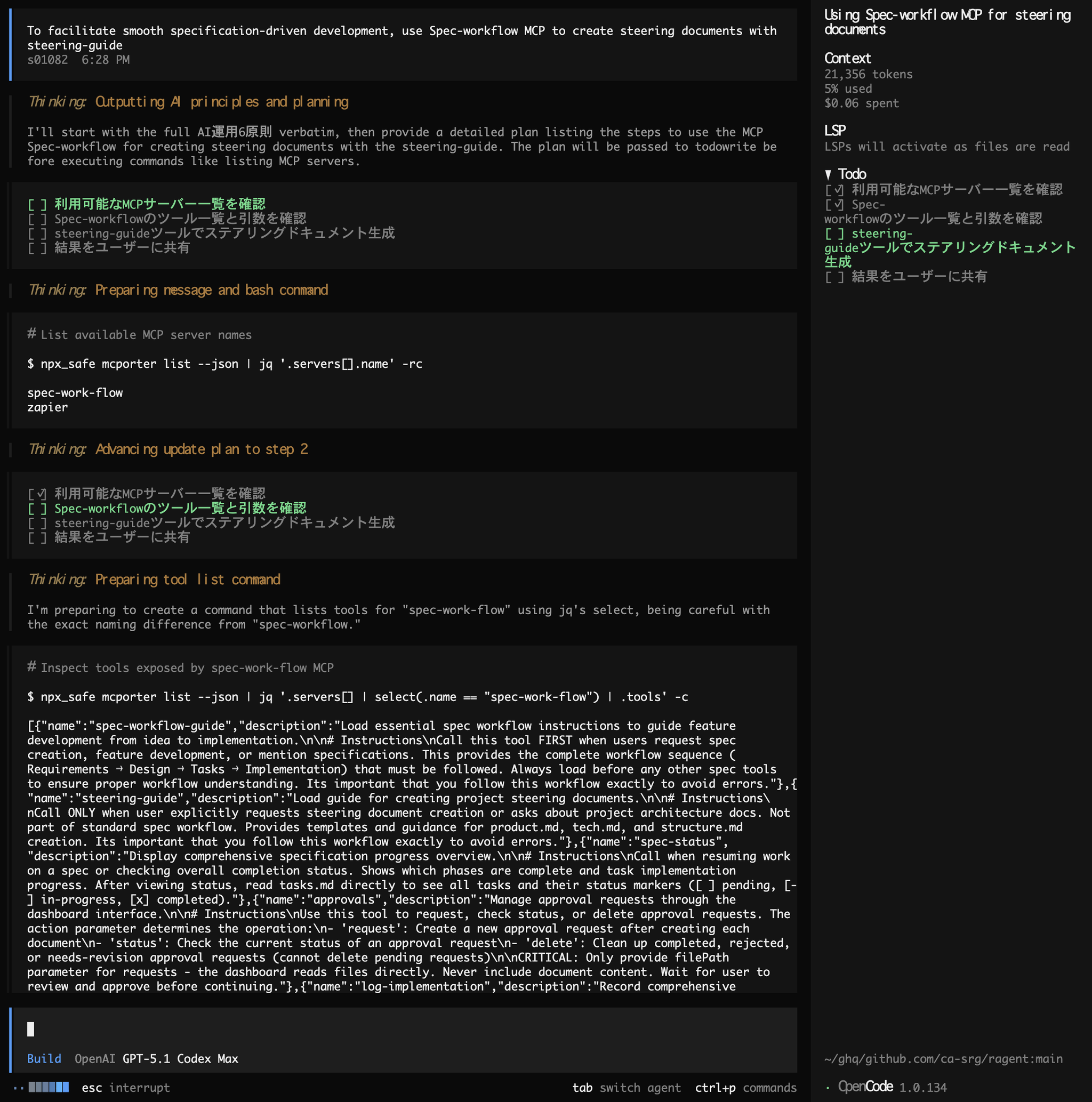 カスタムコマンドでステアリングの作成を呼び出してみると、AGENTS.md で指示した内容で mcporter を利用し、利用可能な MCP サーバーとツールを確認しています。