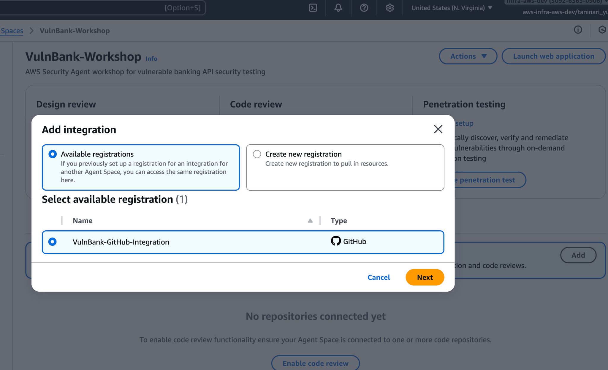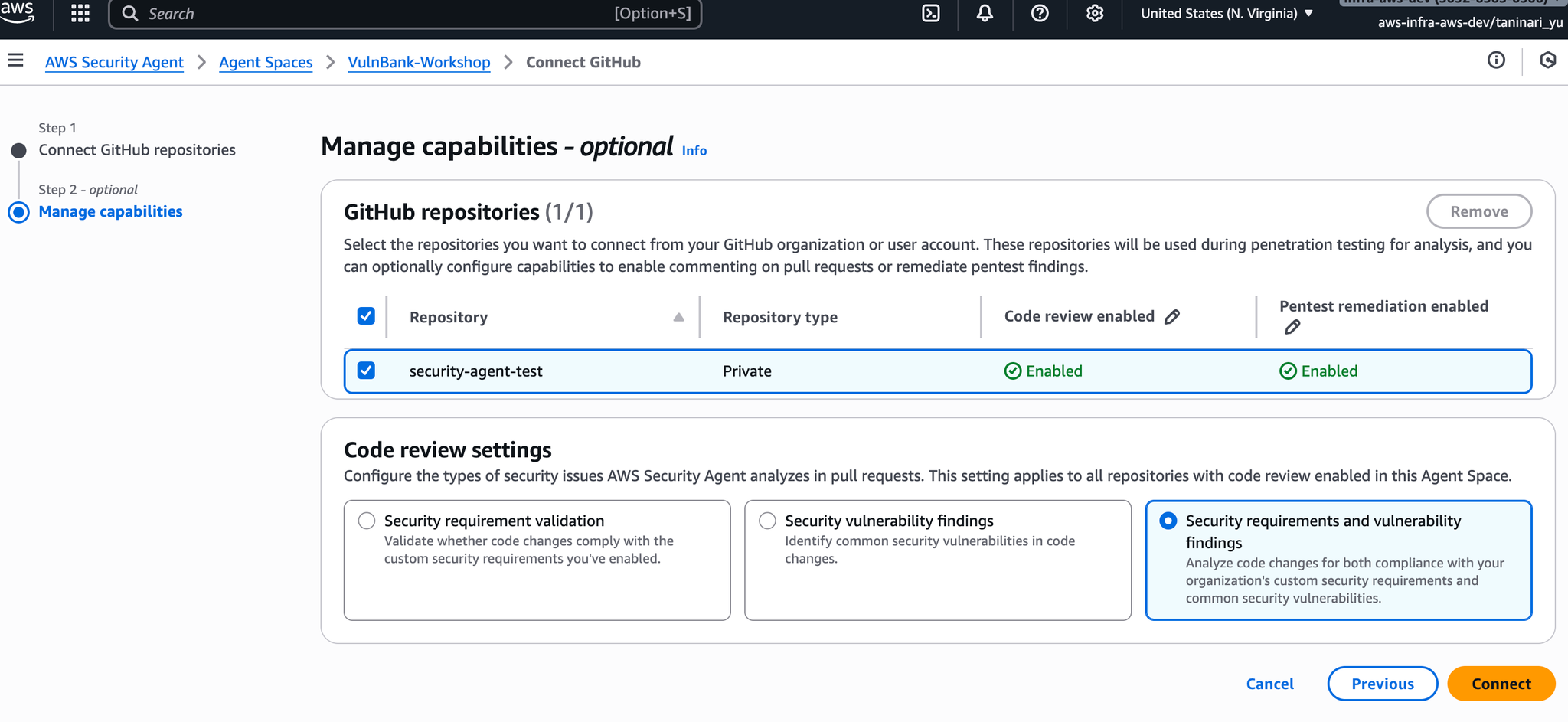 AWS Security Agentは2025/12現在 プレビュー版で US East (N. Virginia)でのみ使用可能となっております