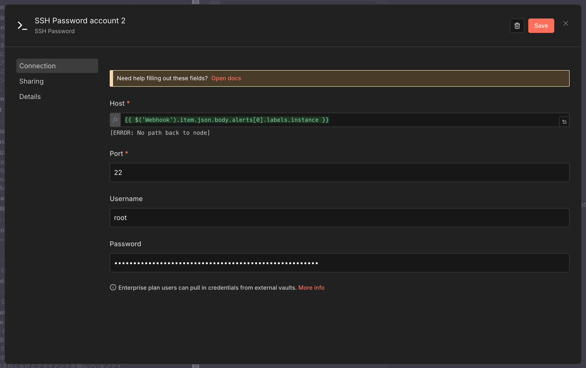 - Webhook Node: Grafana からの POST リクエストを受け取ります。