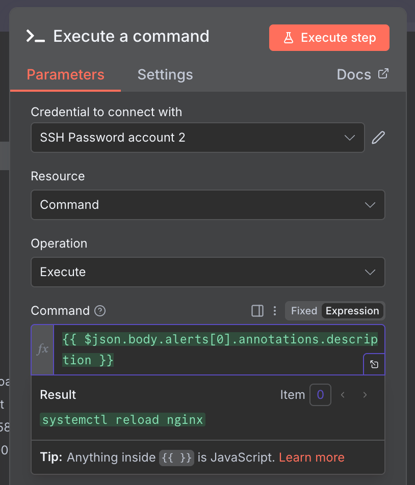 - Execute Command Node: AI が出力したコマンドを受け取り、実際にサーバー上で実行します(SSH ノードを使用する場合もあります)。